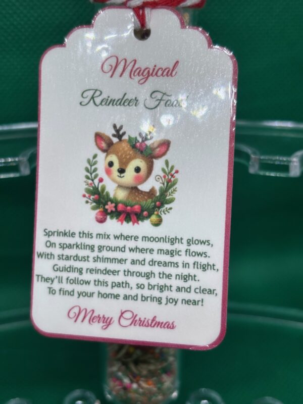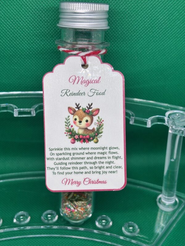 Each festive bottle is filled with a delightful blend of oats, colorful sprinkles, and edible glitter, creating the perfect treat to guide Santa’s reindeer to your home. Every bottle comes adorned with a charming holiday tag, featuring a whimsical reindeer illustration and this heartwarming poem:
